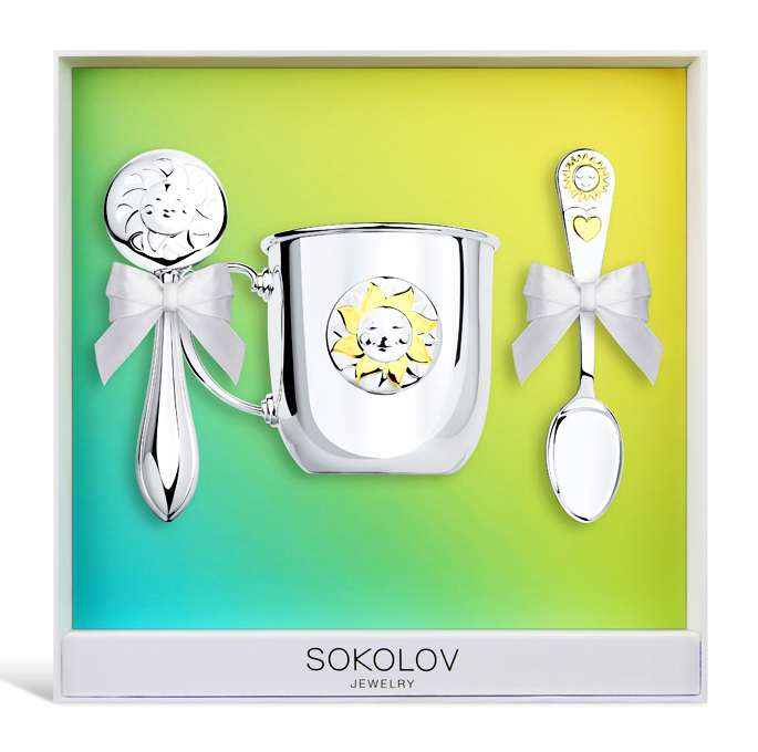 Серебряный детский набор "Солнышко" с позолотой (кружка, ложка, погремушка) 3 предмета