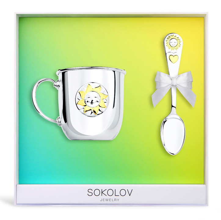 Детская серебряная кружка с ложкой "Солнышко" с позолотой (2 предмета)