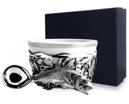 1. Серебряная солонка "Рыба" с ложечкой и чернением арт. 614НБ00006 - 1 шт. (средний вес 71 гр.) Высота 35 мм., Объем 50 мл., Диаметр 60 мм.