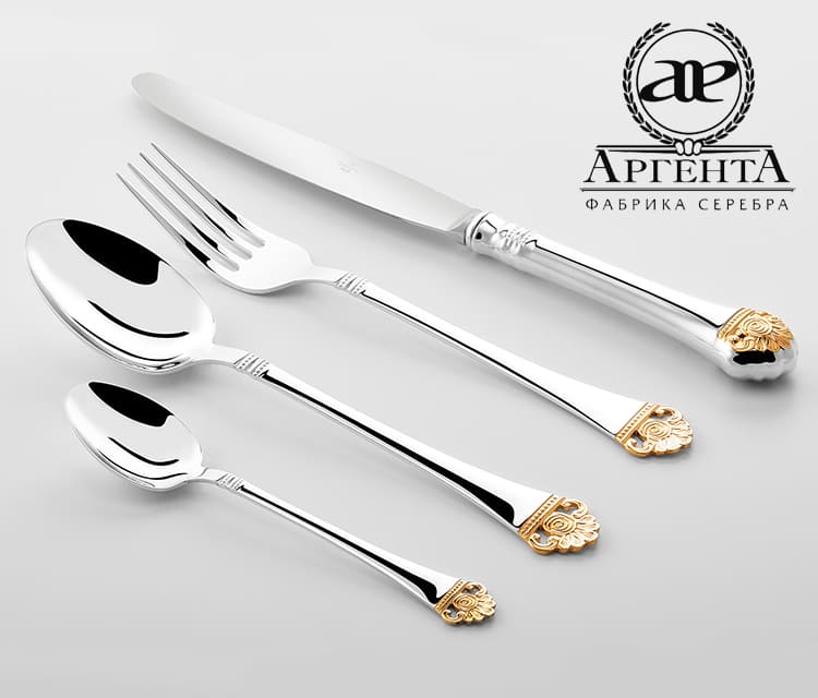 Серебряные столовые приборы из серебра 925 пробы "Афина" с позолотой
