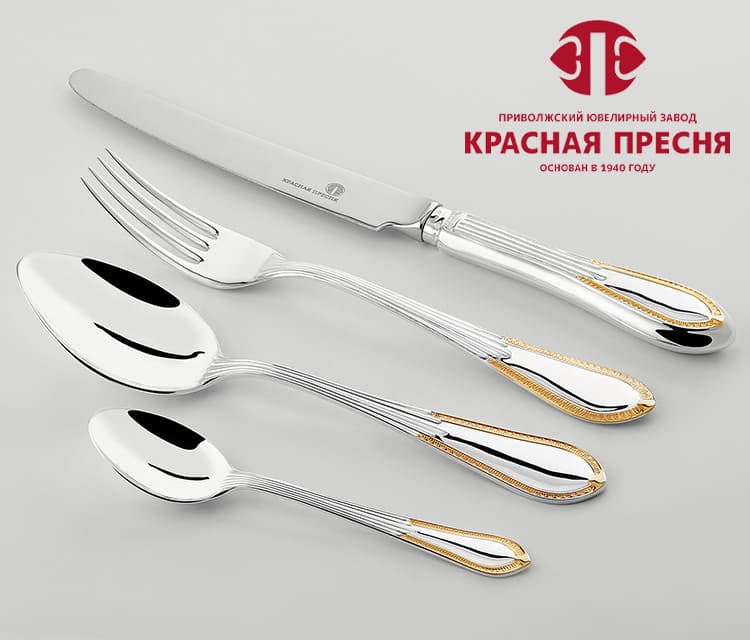 Серебряные столовые приборы из серебра 925 пробы "Ампир" с позолотой