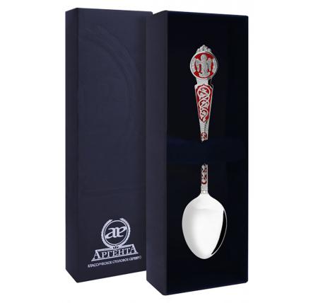 СЕРЕБРЯНАЯ ЧАЙНАЯ ЛОЖКА "АНГЕЛ-ХРАНИТЕЛЬ" С КРАСНОЙ ЭМАЛЬЮ – АРГЕНТА