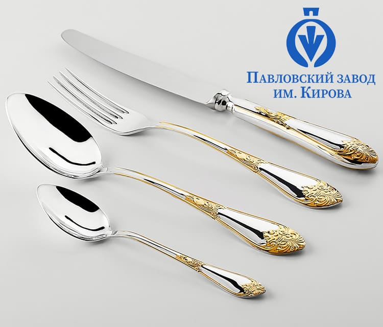 Серебряные столовые приборы из серебра 925 пробы "Дворцовый" М-17 с позолотой