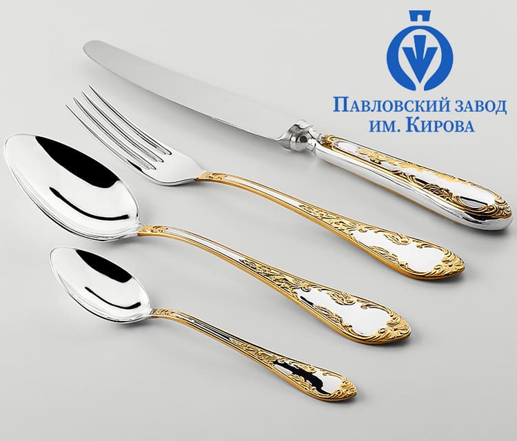 Серебряные столовые приборы из серебра 925 пробы "Посольский" М-18 с позолотой