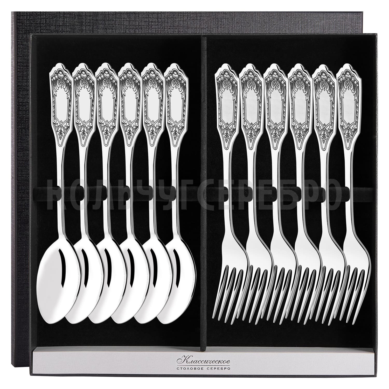 СЕРЕБРЯНЫЙ СТОЛОВЫЙ НАБОР "ФАМИЛЬНЫЙ" С ЧЕРНЕНИЕМ (6 ВИЛОК, 6 ЛОЖЕК) - СЕВЕРНАЯ ЧЕРНЬ
