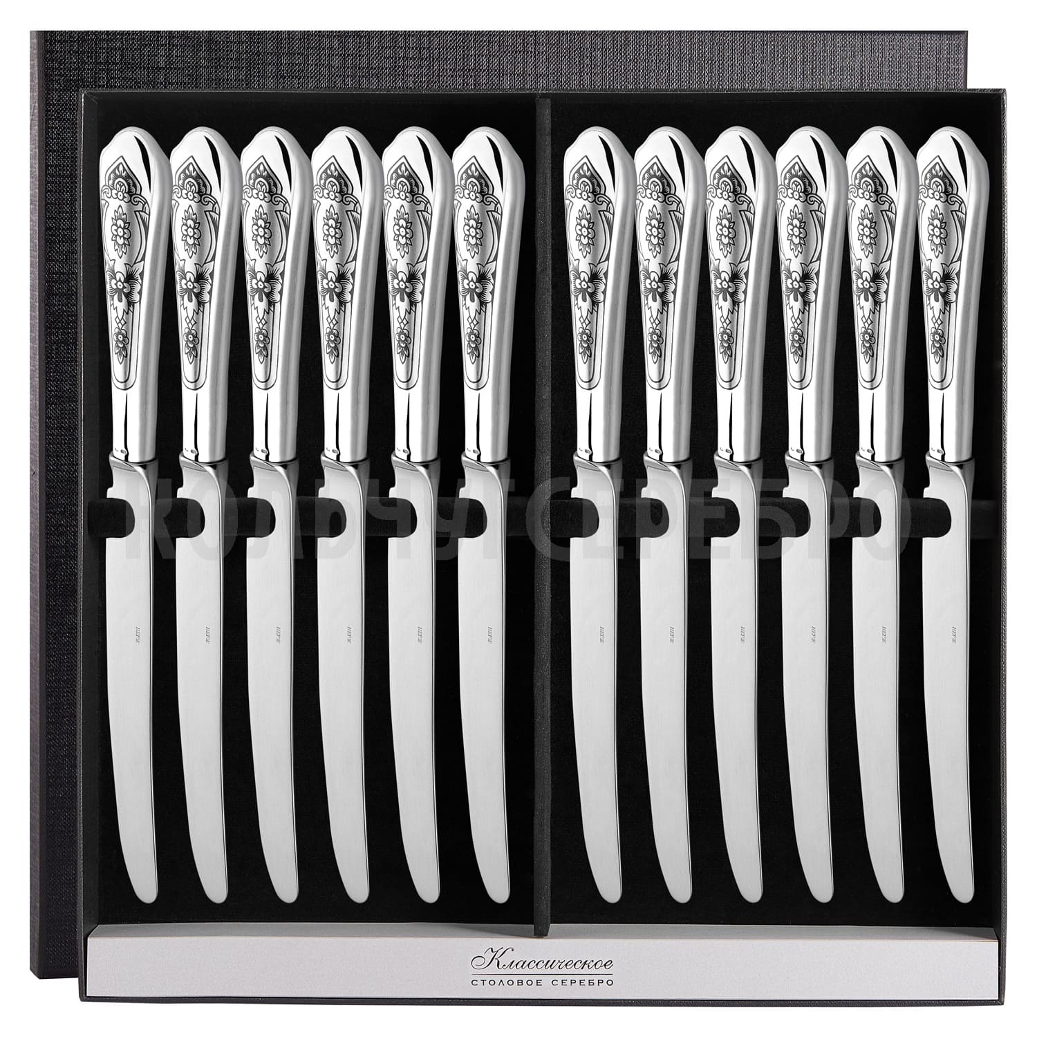 СЕРЕБРЯНЫЙ СТОЛОВЫЙ НАБОР "ПРАЗДНИЧНЫЙ" С ЧЕРНЕНИЕМ (12 СТОЛОВЫХ НОЖЕЙ) - СЕВЕРНАЯ ЧЕРНЬ