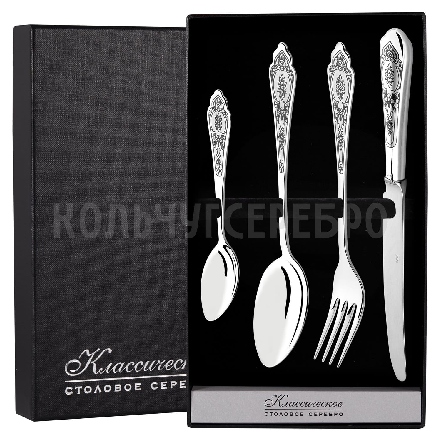 СЕРЕБРЯНЫЙ СТОЛОВЫЙ НАБОР "ПРАЗДНИЧНЫЙ" С ЧЕРНЕНИЕМ (4 ПРЕДМЕТА) - СЕВЕРНАЯ ЧЕРНЬ