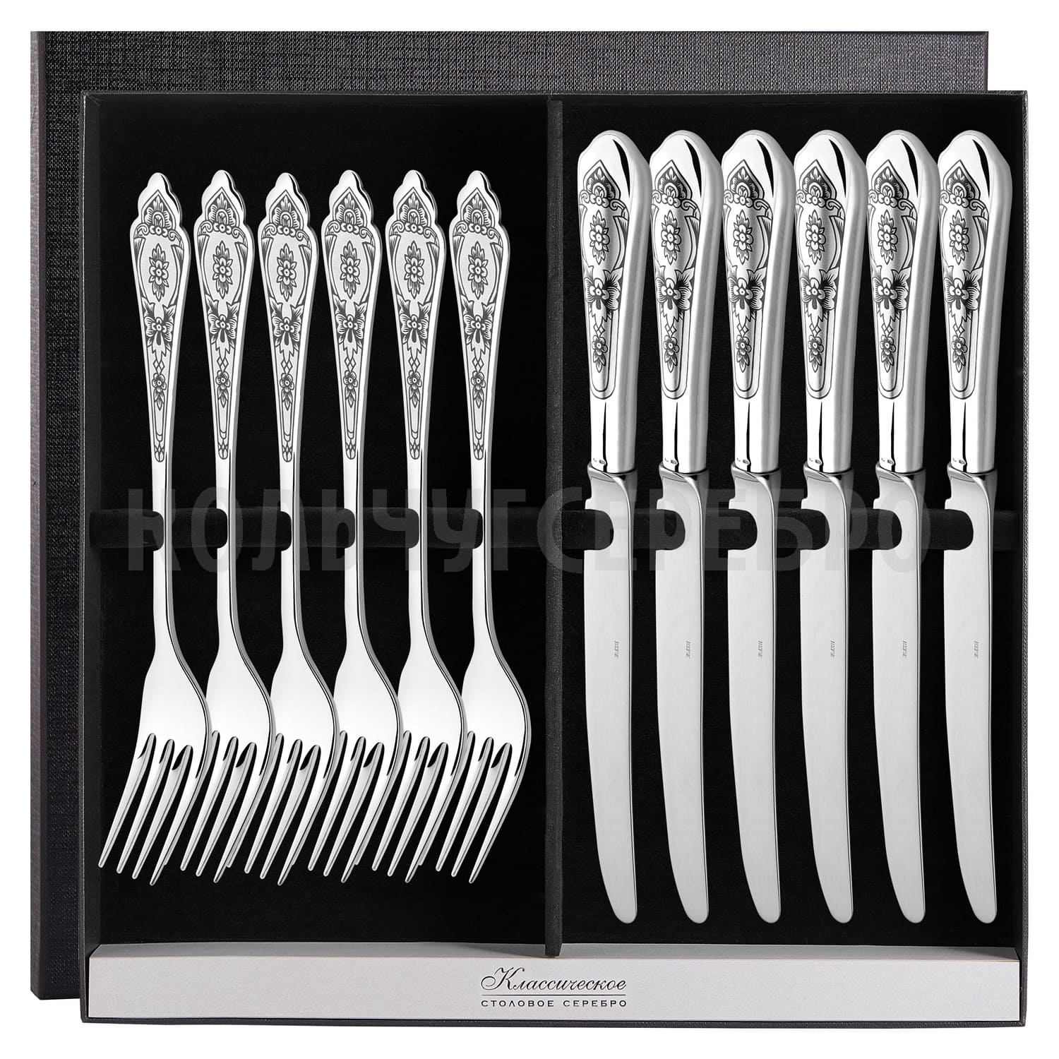 СЕРЕБРЯНЫЙ СТОЛОВЫЙ НАБОР "ПРАЗДНИЧНЫЙ" С ЧЕРНЕНИЕМ (6 ВИЛОК, 6 НОЖЕЙ) - СЕВЕРНАЯ ЧЕРНЬ